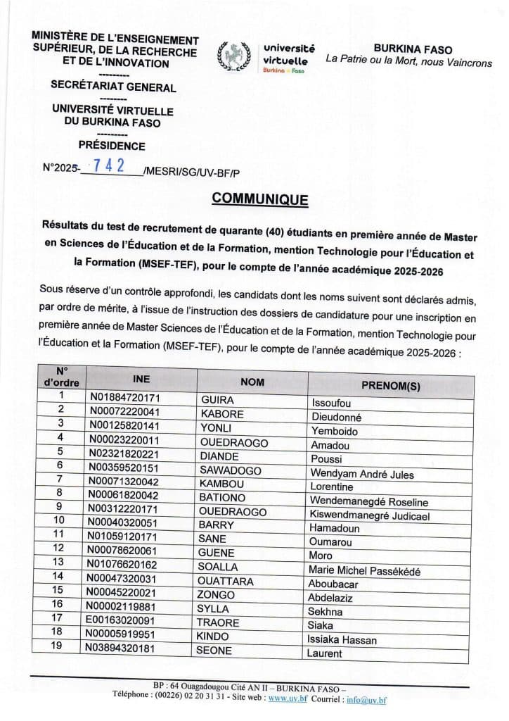 COMMUNIQUÉ : Résultats du test de recrutement de quarante (40) étudiants en première année de Master en Sciences de l’Éducation et de la Formation, mention Technologie pour l’Éducation et la Formation (MSEF-TEF), pour le compte de l’année académique 2025-2026