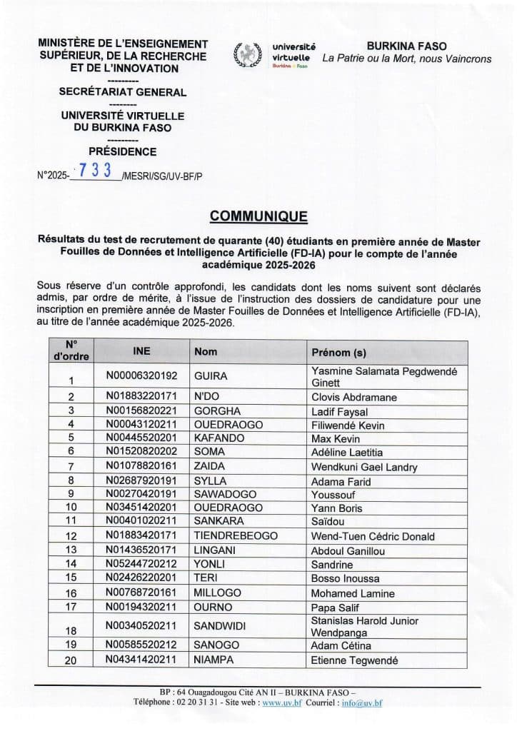 COMMUNIQUÉ : Résultats du test de recrutement de Fouilles de Données et Intelligence Artificielle de quarante (40) étudiants en première année de Master (FD-IA), pour le compte de l’année académique 2025-2026