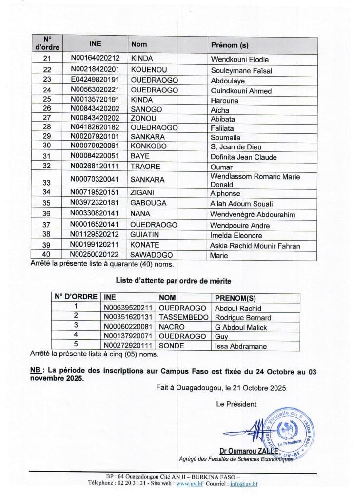 Sous réserve d’un contrôle approfondi, les candidats dont les noms suivent sont déclarés admis, par ordre de mérite à l’issue de l’instruction des dossiers de candidature pour une inscription en première année de Master Fouilles de Données et Intelligence Artificielle (FD-IA). au titre de l’année académique 2025-2026.