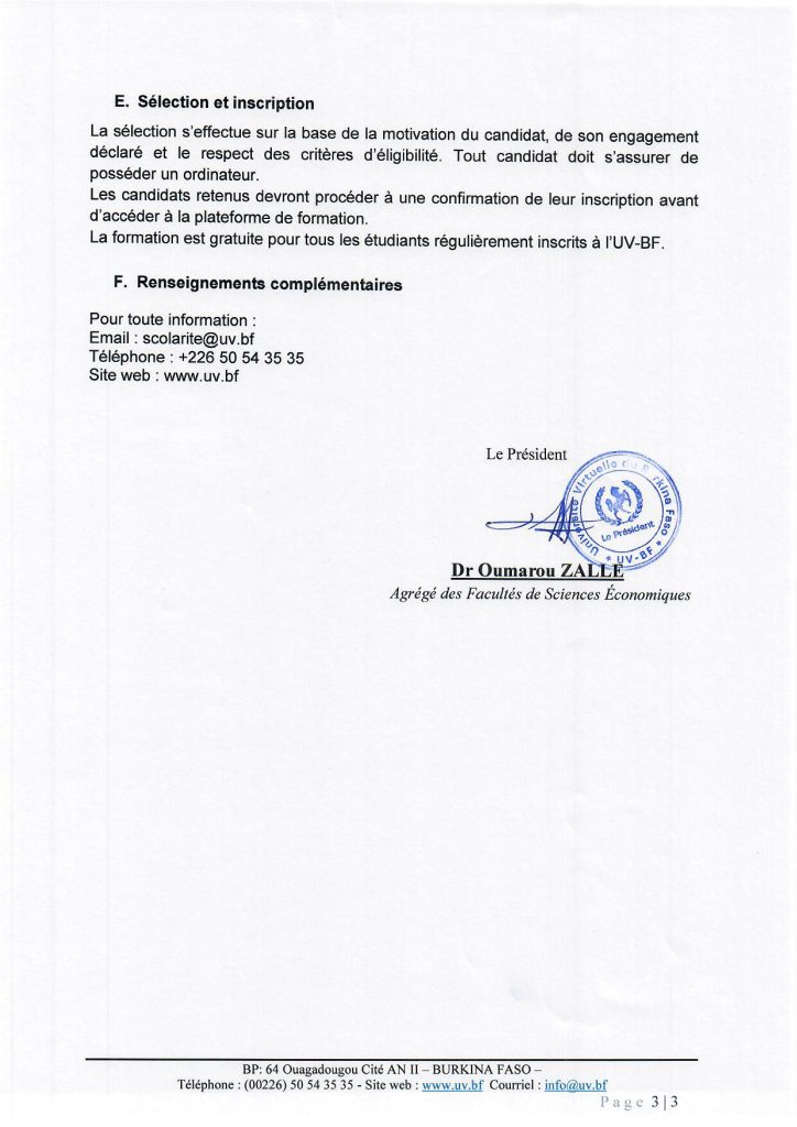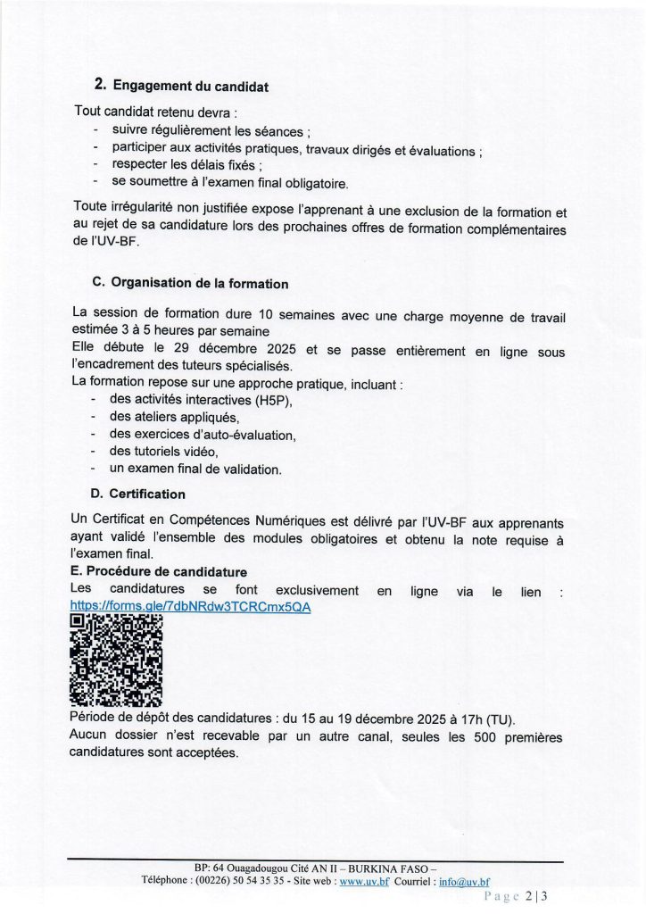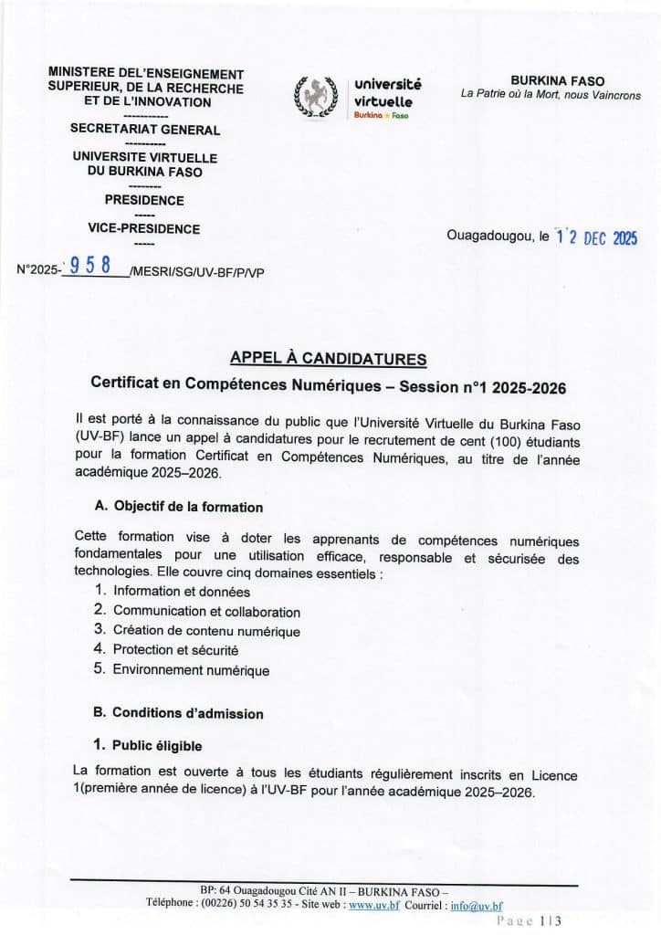 Il est porté à la connaissance du public que l’Université Virtuelle du Burkina Faso (UV-BF) lance un appel à candidatures pour le recrutement de cent (100) étudiants pour la formation Certificat en Compétences Numériques, au titre de l’année académique 2025-2026.