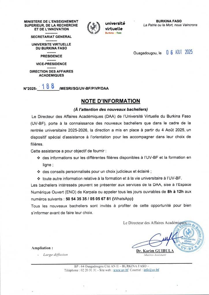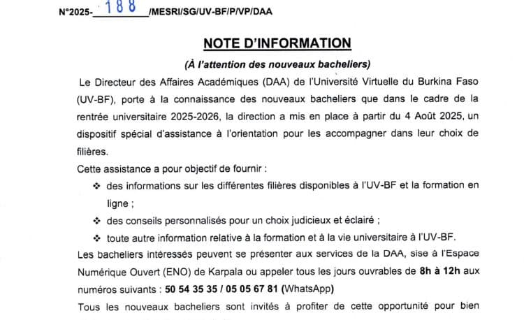 Le Directeur des Affaires Académiques (DAA) de I’ Université Virtuelle du Burkina Faso (UV-BF), porte à la connaissance 𝐝𝐞𝐬 𝐧𝐨𝐮𝐯𝐞𝐚𝐮𝐱 𝐛𝐚𝐜𝐡𝐞𝐥𝐢𝐞𝐫𝐬 que dans le cadre de la 𝐫𝐞𝐧𝐭𝐫𝐞́𝐞 𝐮𝐧𝐢𝐯𝐞𝐫𝐬𝐢𝐭𝐚𝐢𝐫𝐞 𝟐𝟎𝟐𝟓-𝟐𝟎𝟐𝟔, la direction a mis en place à partir du 𝟒 𝐚𝐨𝐮̂𝐭 𝟐𝟎𝟐𝟓, un dispositif spécial d’assistance à l’orientation pour les accompagner dans leur choix de filières.